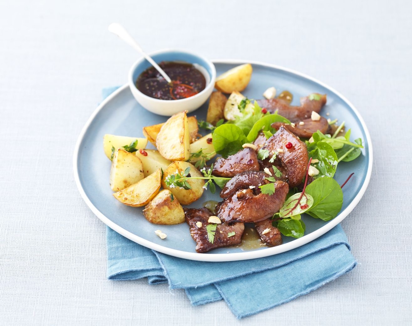 Servir le groin de porc accompagné des pommes de terre et de la salade.